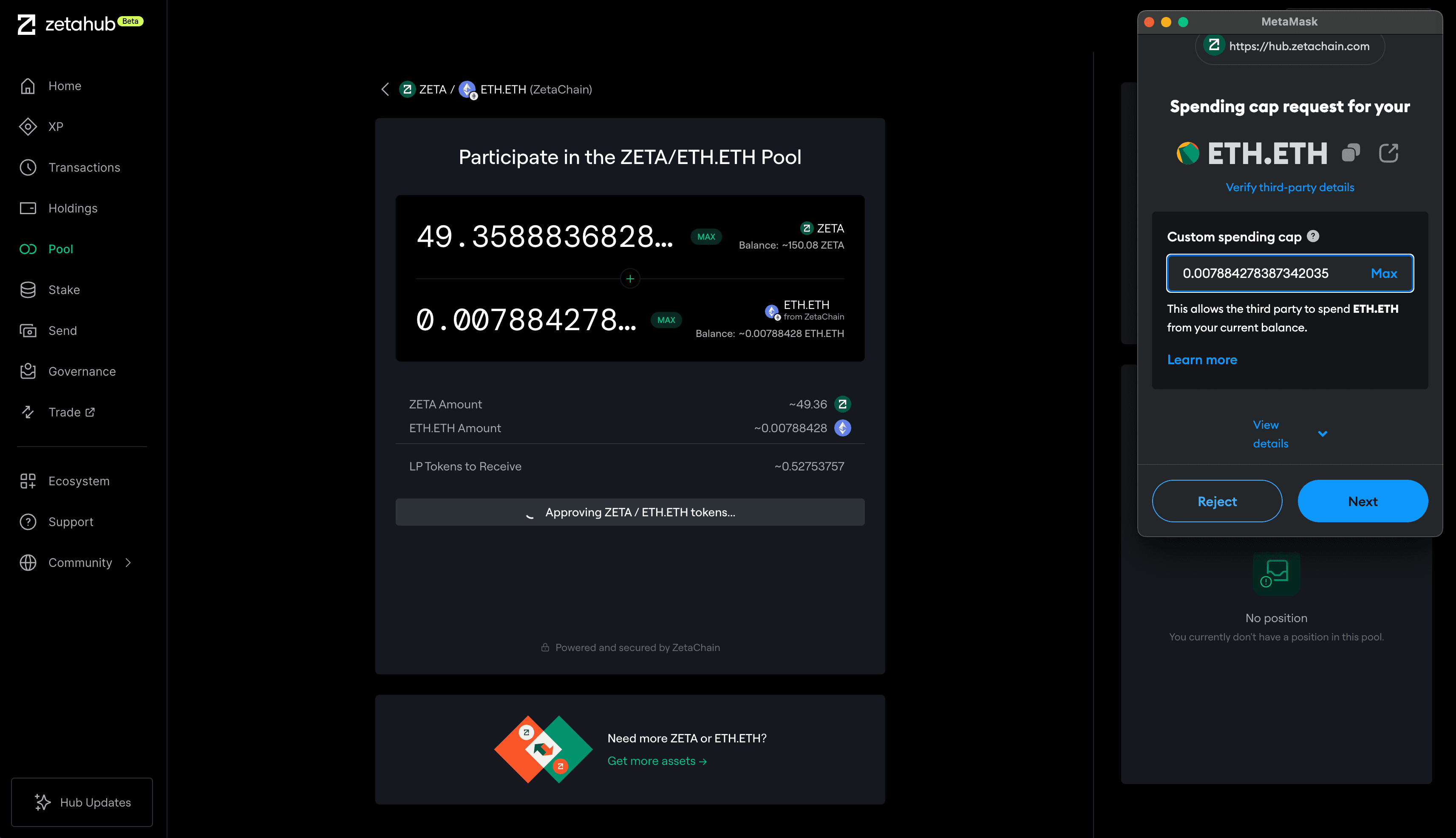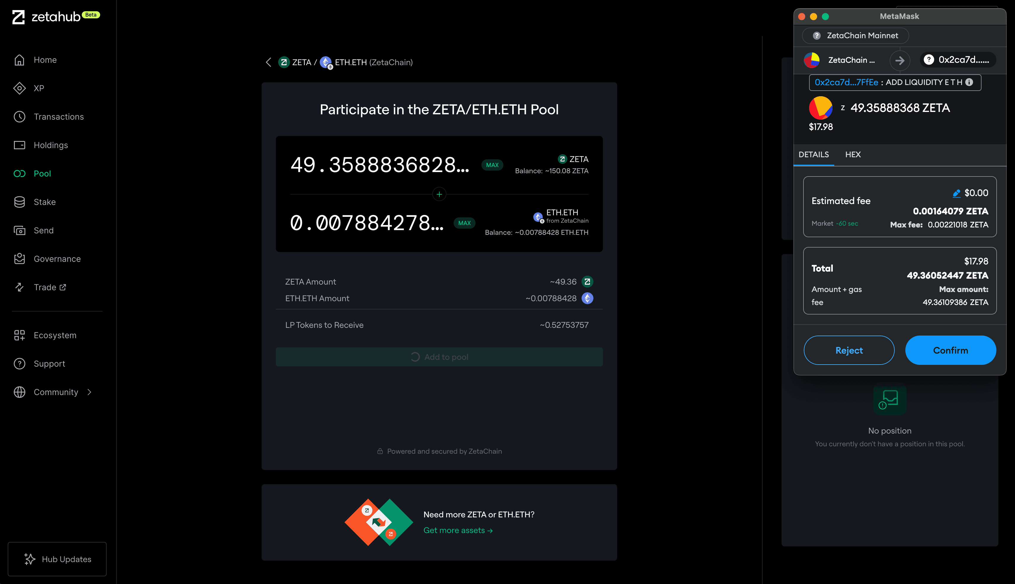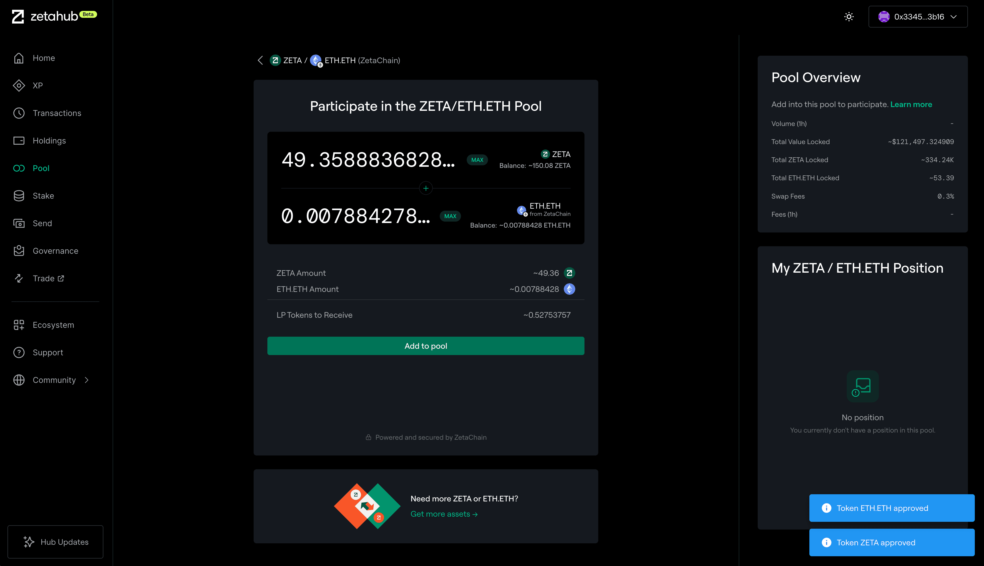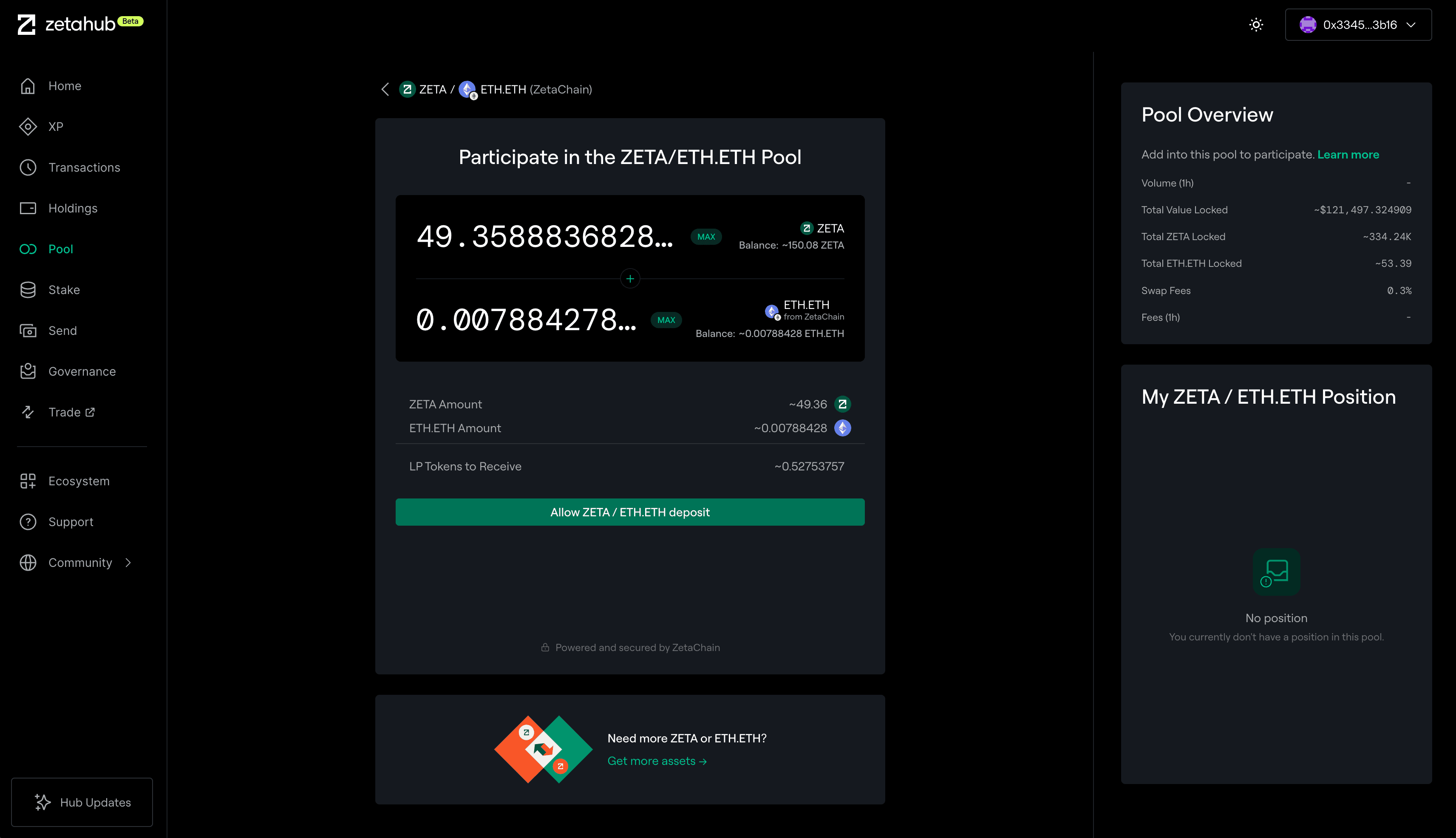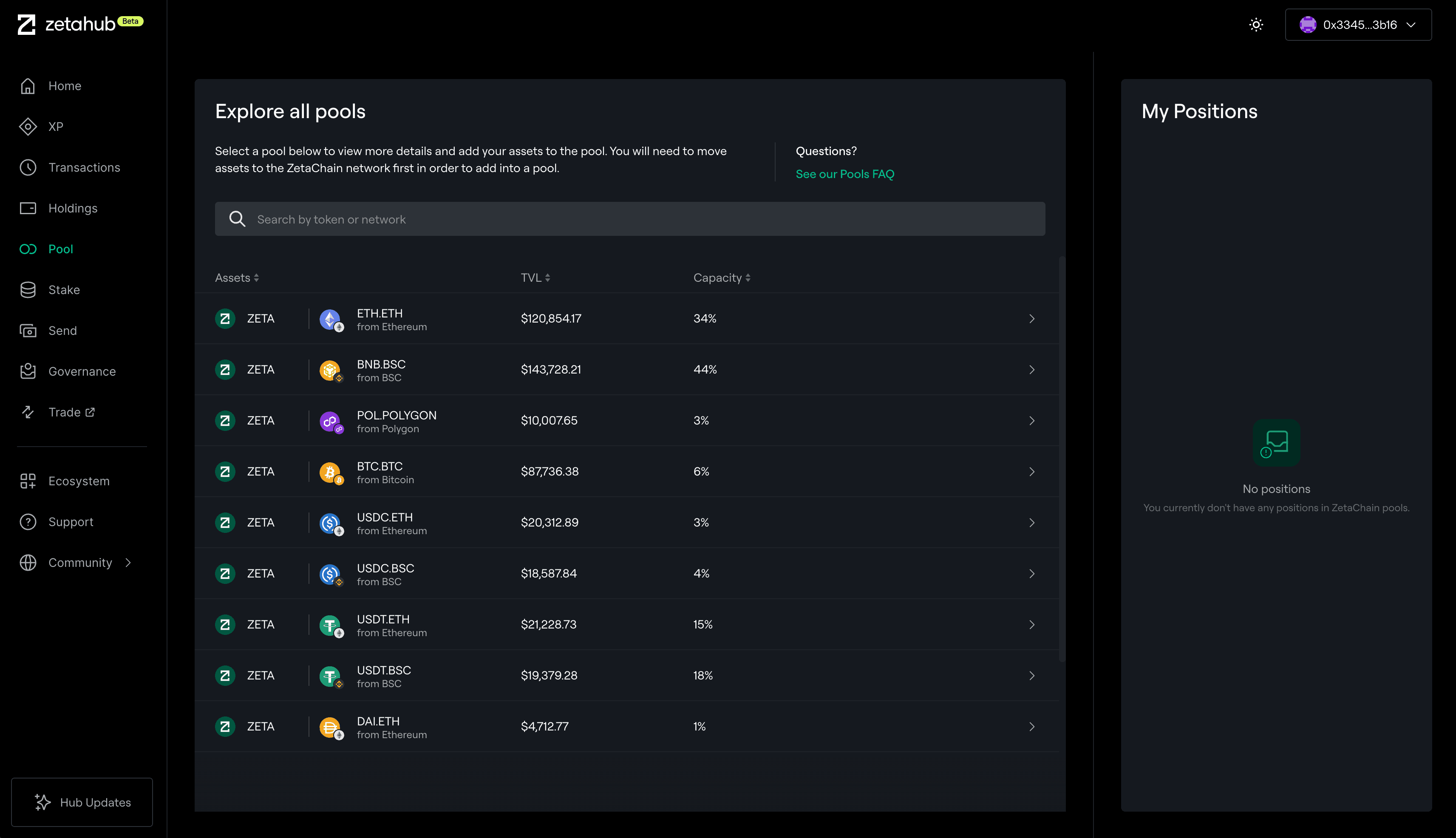 ZetaHub 的流动性池基于自动做市商(AMM)机制,为 ZetaChain 的全链功能提供支持。通过界面可向池中存入资产,按比例分享手续费。